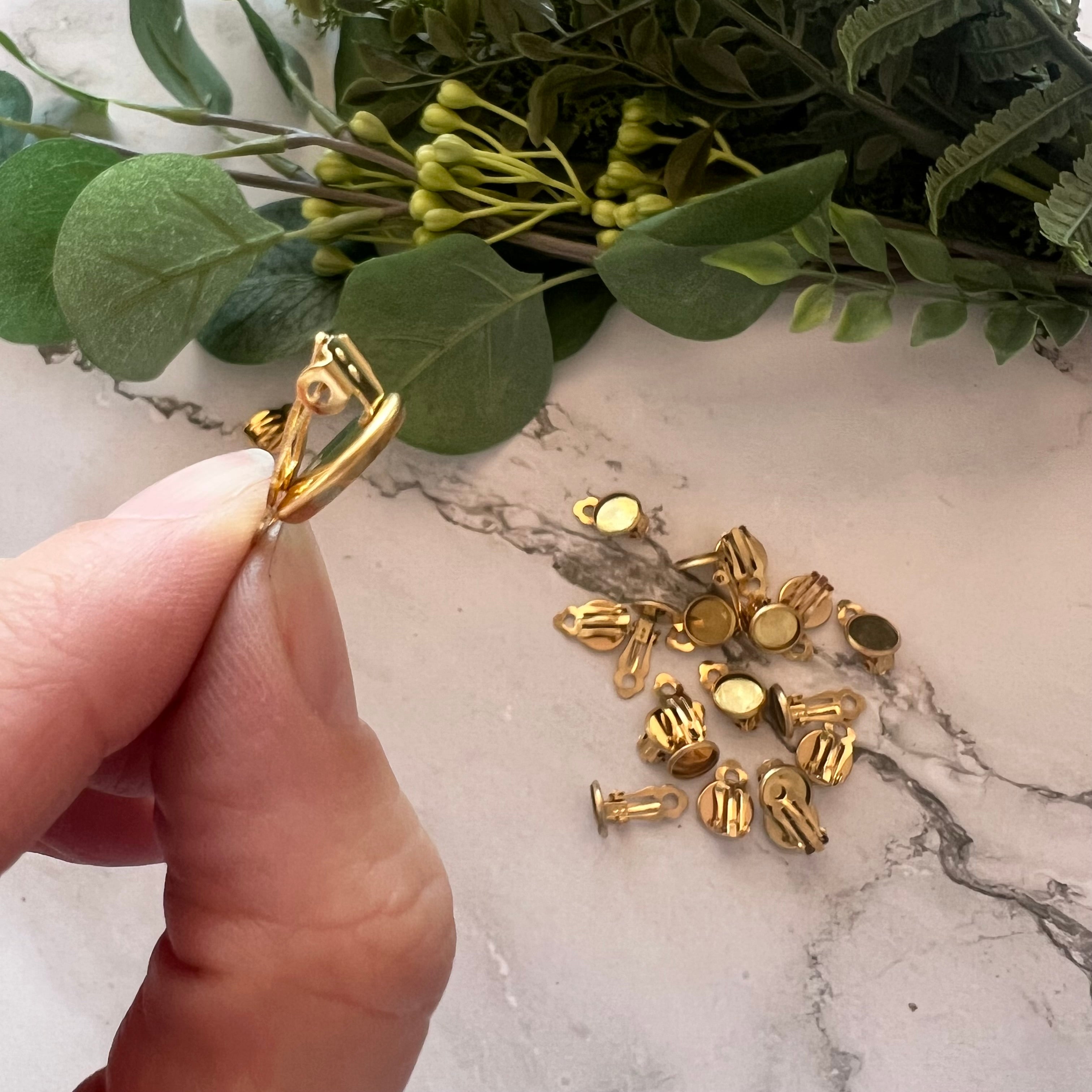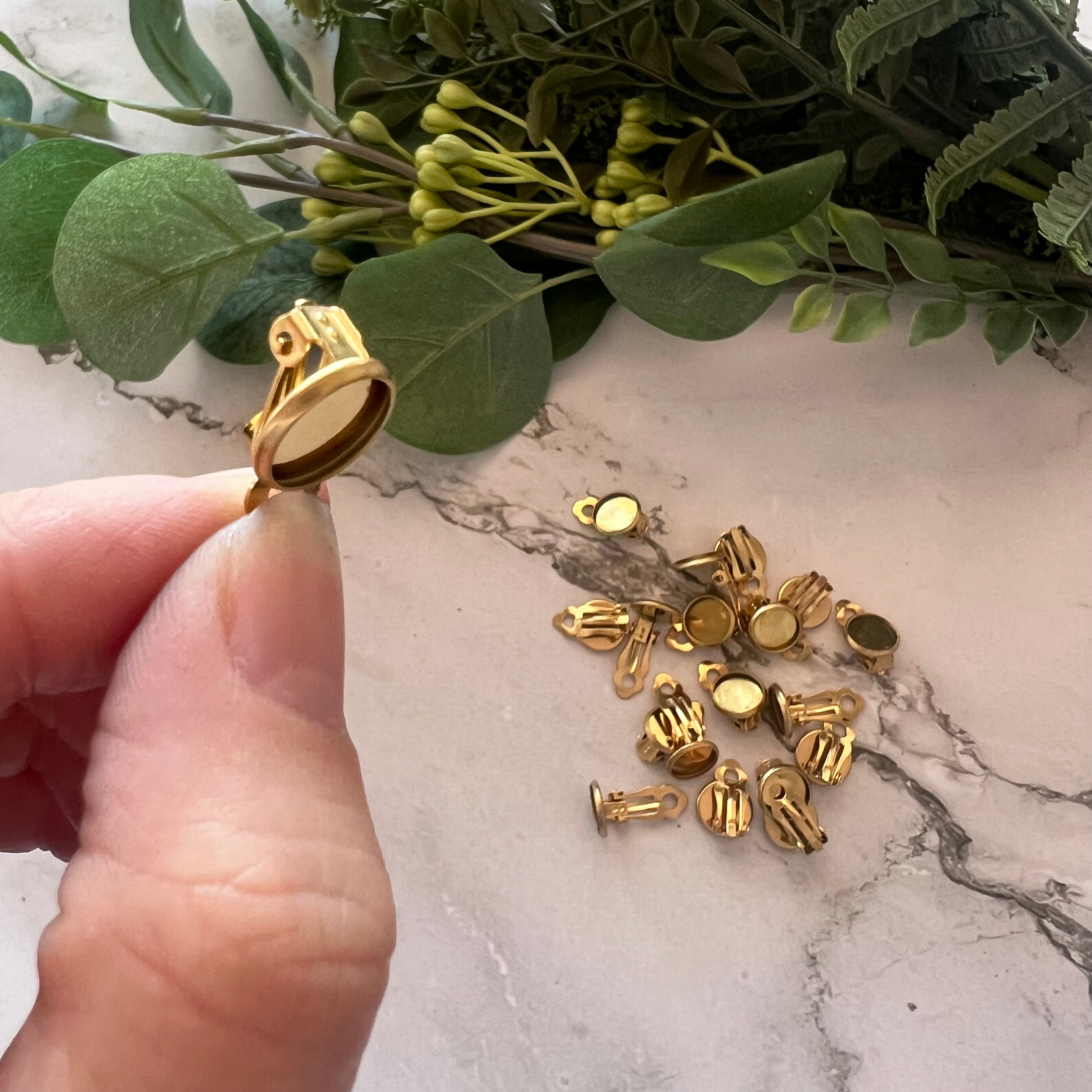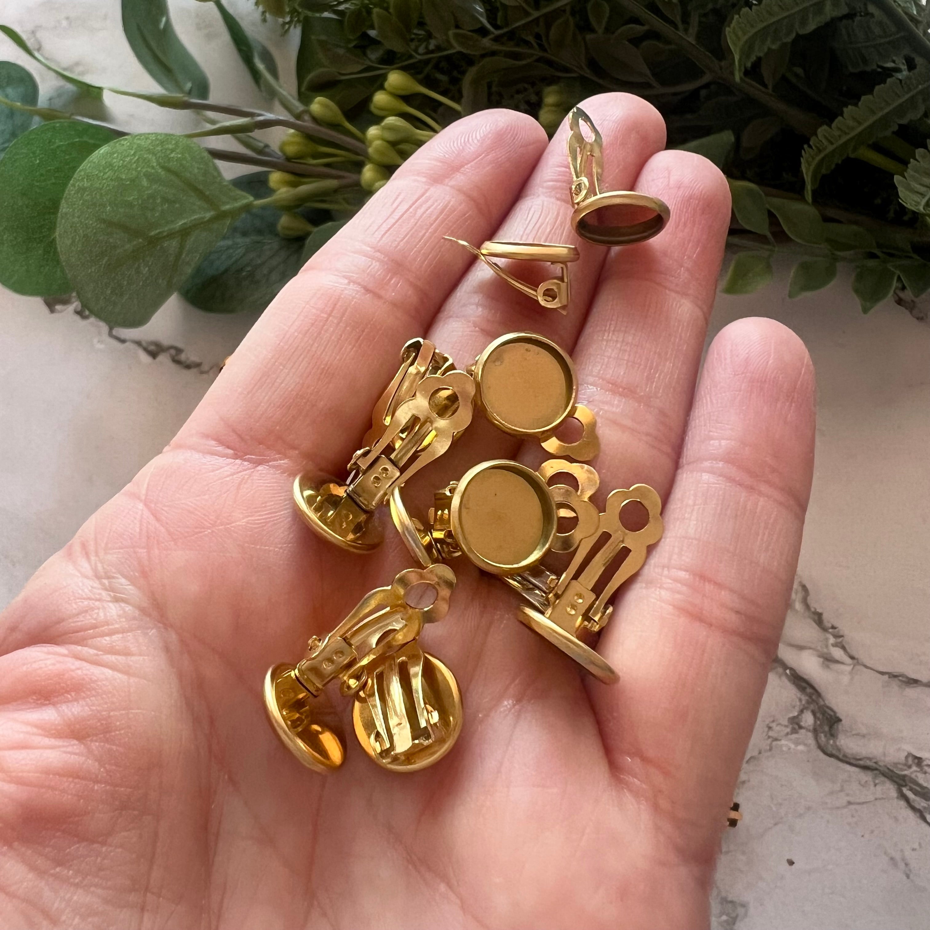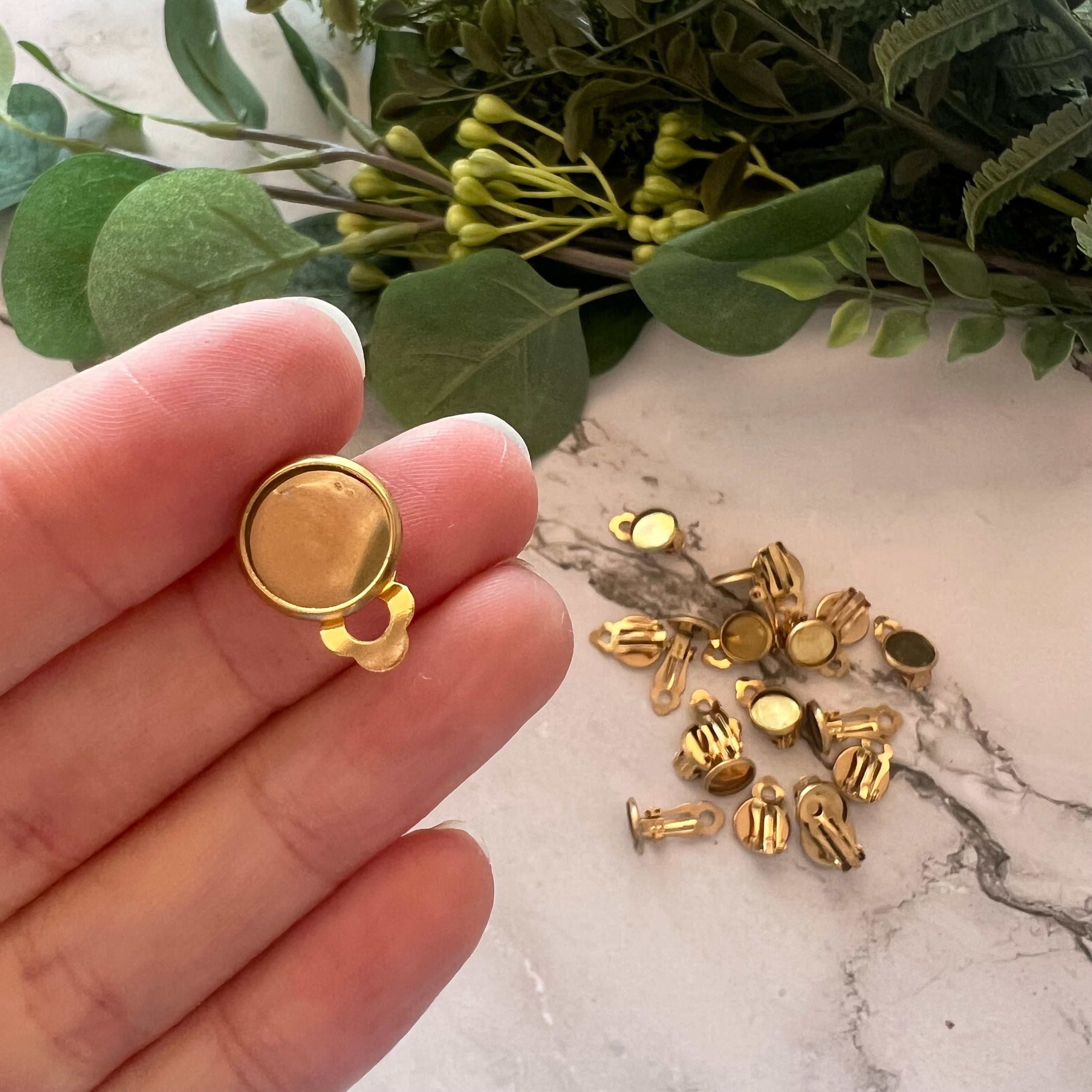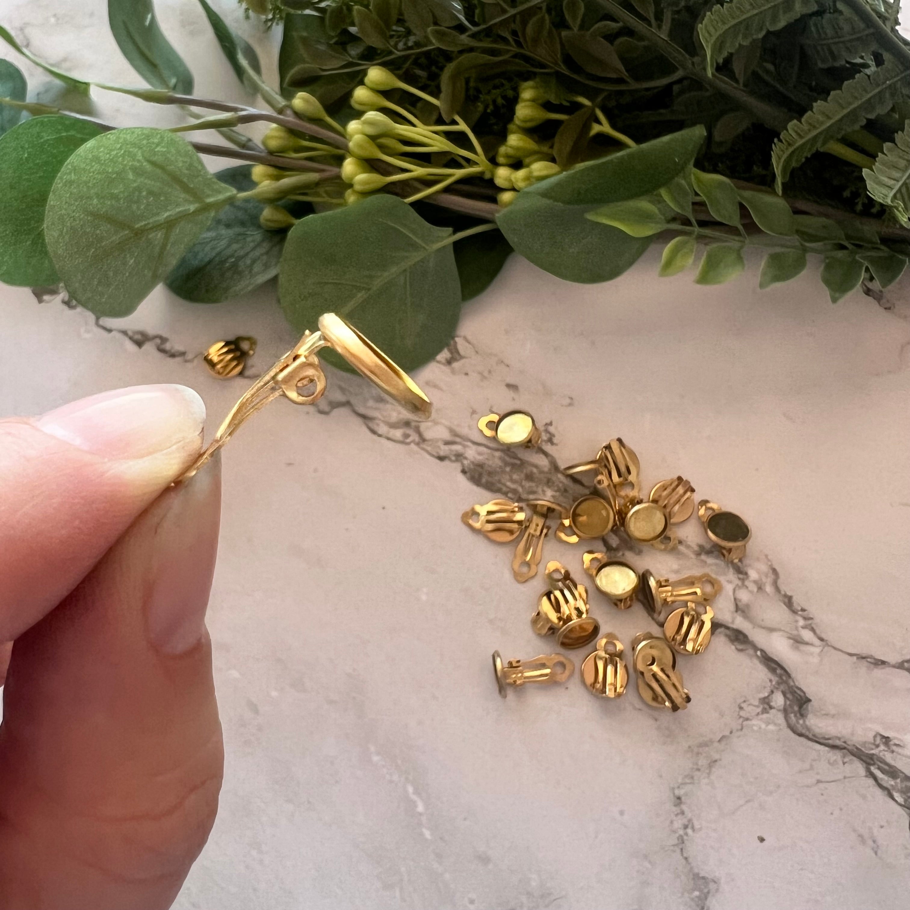 Our Minimalist Bezel Clip-on Earrings are a quick and easy way to create beautiful clip-on stud earrings. Made with Stainless Steel (304), they are gold plated and measure approximately 10mm.